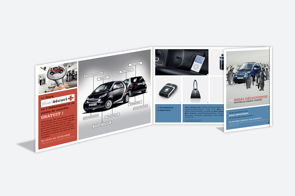 Campagne de promotion des contrats de service à travers la mise en place de kits auprès des concessions SMART. Déclinaison mailing + affiche.
